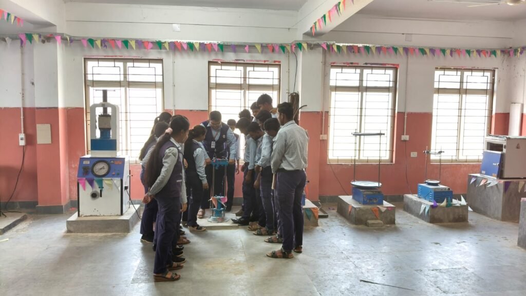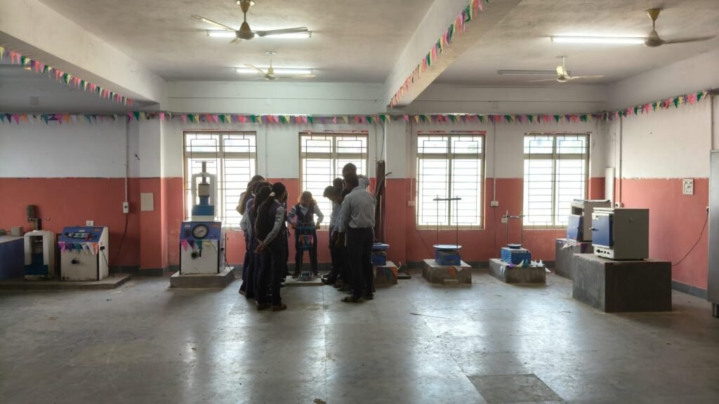In this laboratory, students conduct various tests on construction materials such as aggregate and bitumen. The experiments include the Flakiness and Elongation Index of aggregates, Angularity number of aggregates, Aggregate impact test, Los Angeles Abrasion test, Aggregate crushing test, Softening point test of bitumen, Penetration test of bitumen, Flash and fire point of bitumen, Ductility test of bitumen.